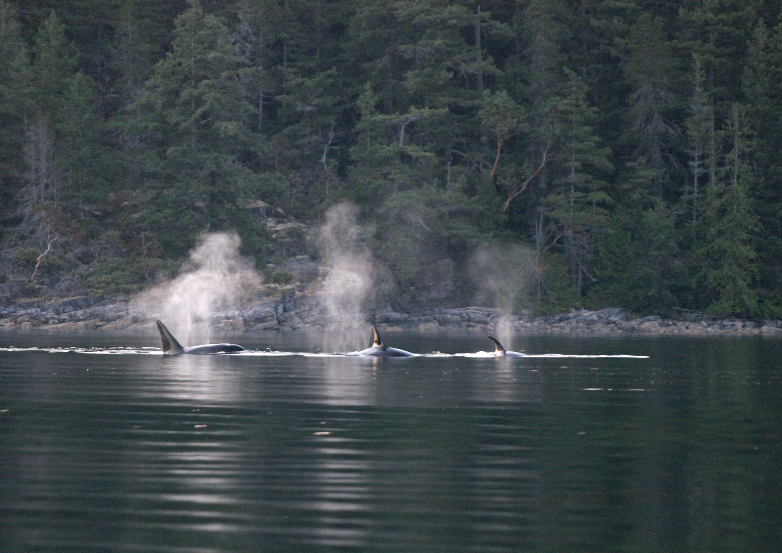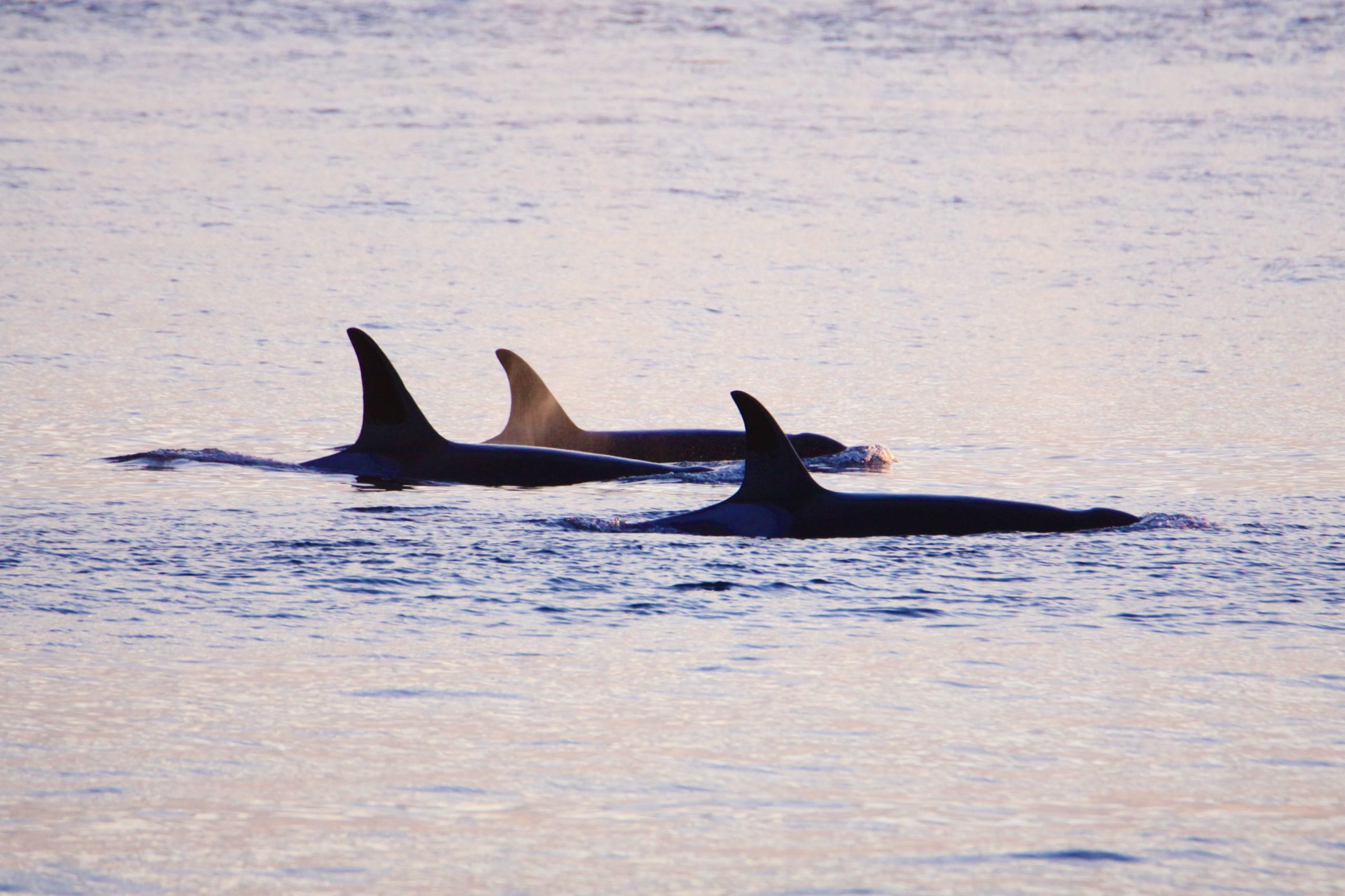 - Erin MacKenzie: Three transient killer whales with the mist from their blows, being caught in the sunlight.