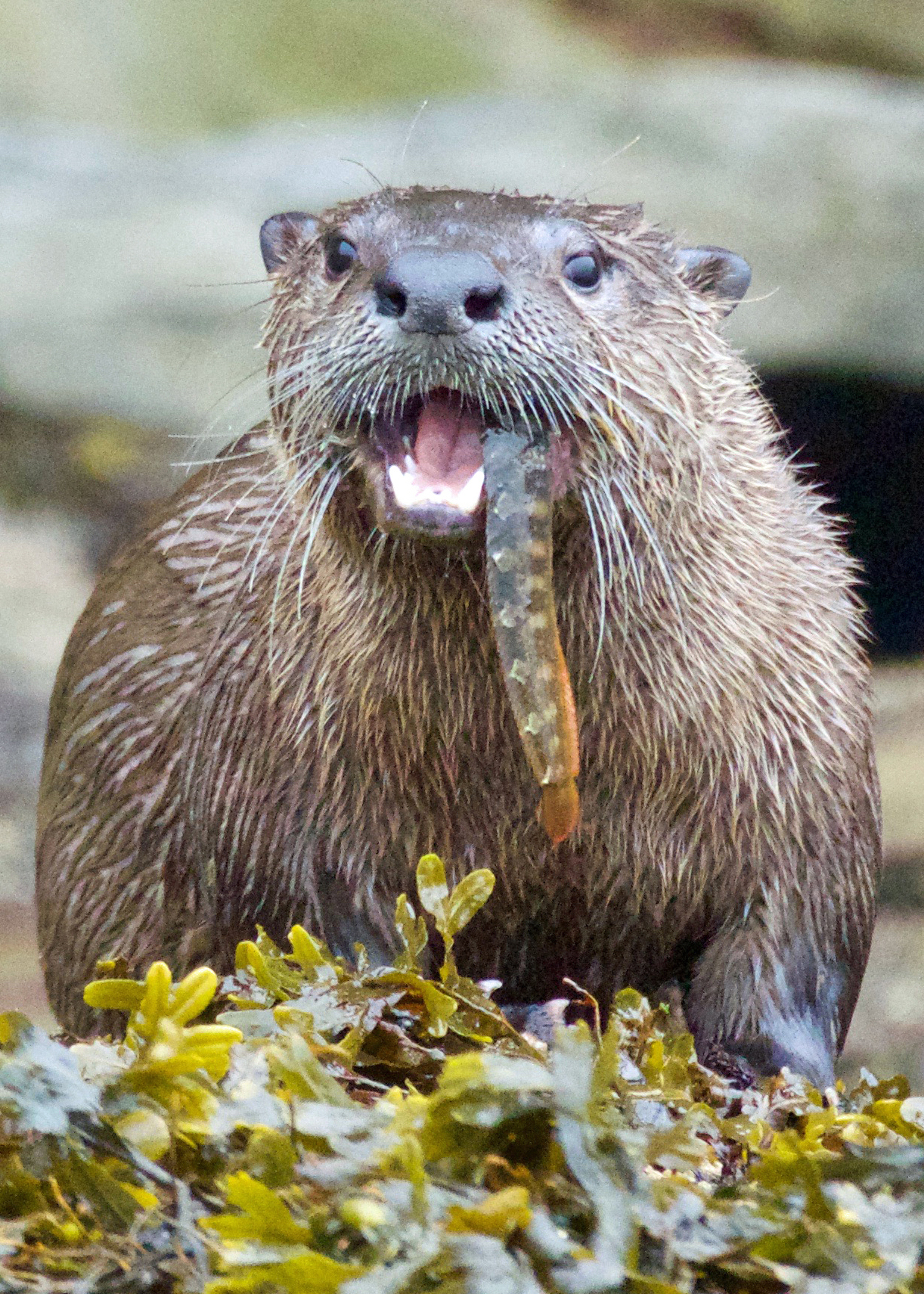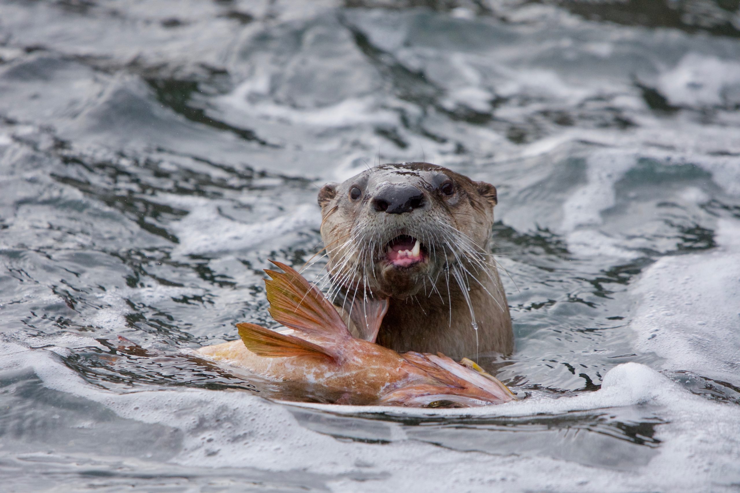 - Daniel Lacy: I often go down to Clover Point in the morning to observe the various wild creatures that frequent the area. River otters are often to be seen fishing along the rocks there and I was fortunate to be in the right place when this beautiful otter swam ashore with a large rockfish. Victoria waterfront (telephoto zoom)