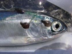 Juvenile sockeye salmon infected with sea lice. You can see egg strings on the female louse at the top. Photo by Jody Eriksson