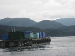 Dead farmed salmon ‘Mort Tubs’ Sonora/Okisollo Fish Farm in background Photo by Michelle Young