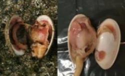 Damaged clam harvested near fish farm on left Healthy clam on the right Photo: Robert Mountain