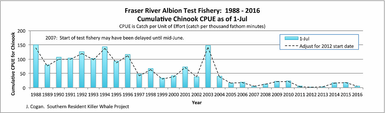 Figure 1: Graph sourced from the Center for Whale Research. The graph demonstrates the cumulative catch per unit effort (CPUE) of Fraser River chinook salmon as of July 1 for each of the years beginning in 1988, with the dashed line representing an adjustment for the late start in the fishery opening using 2012 as the reference year for a late start. Continue reading