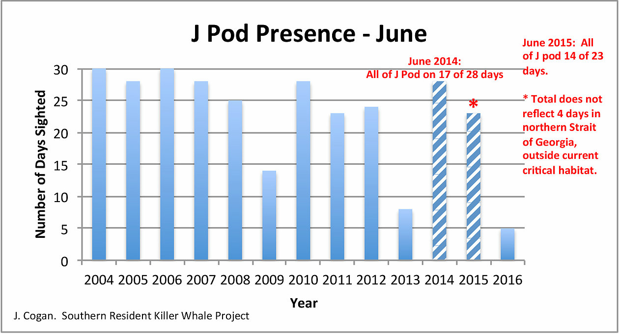 Figure 3: Graph sourced from the Center for Whale Research. The graph depicts the number of times J-pod was seen in their core summer habitat in the month of June from 2004 to 2016. Continue reading